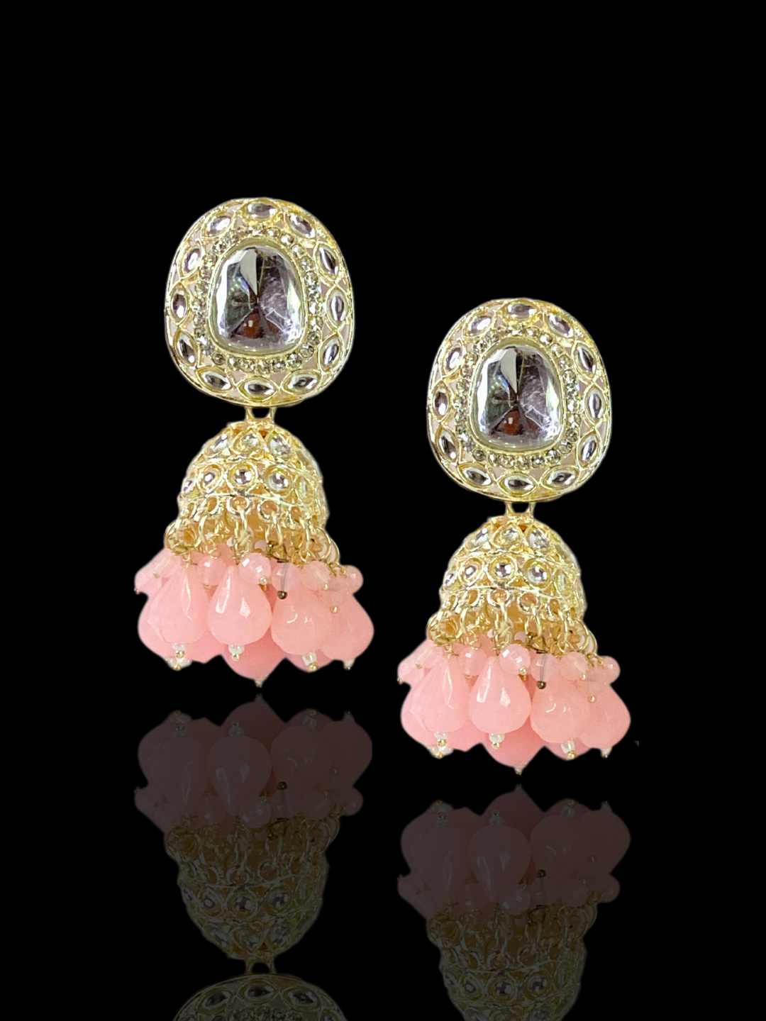 Add a touch of elegance to your ethnic ensemble with these stunning Kundan Baby Pink Jhumkas. Featuring delicate Baby Pink Moti, shimmering zircon stones, and a luxurious gold-plated finish, these jhumkas are perfect for weddings, festive occasions, or traditional gatherings. The lightweight and medium-sized design ensure comfort for all-day wear while adding a timeless charm to your outfit. Pair them with sarees, lehengas, or Anarkalis for a sophisticated look.